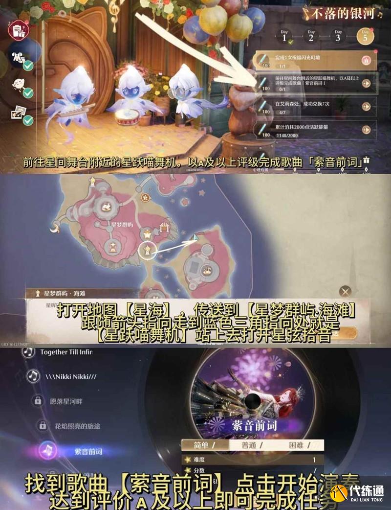 打开地图找到星海,传送到【星梦群屿·海滩】跟随箭头指向走到蓝色三角指向处就是【星跃喵舞机】站上去打开星弦拾音,找到舞曲【萦音前词】,点击演奏,达到评价A及以上即可完成任务