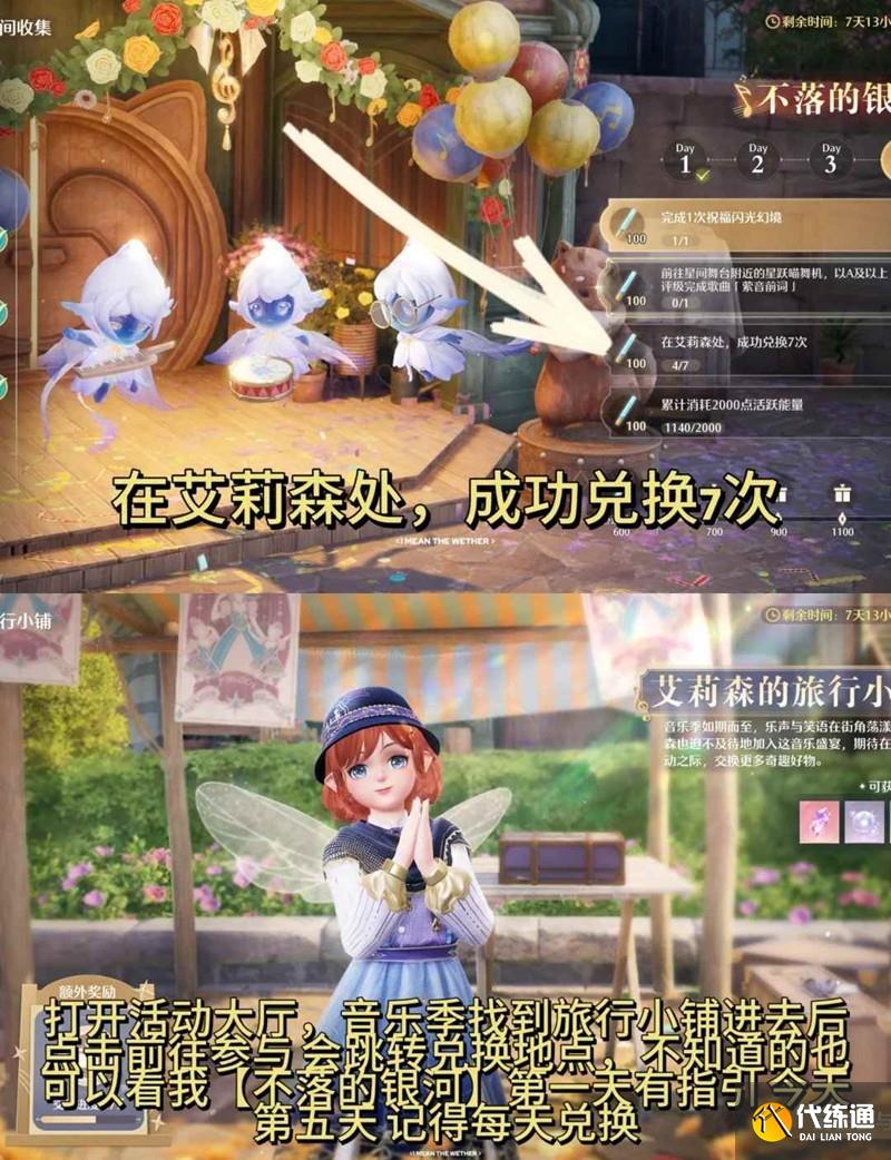 打开活动大厅,音乐季找到旅行小铺进去后点击前往参与会挑战地点,不知道去的也可以看我另外一个作品【不落的银河】第一天,今天是第五天 记得每天兑换