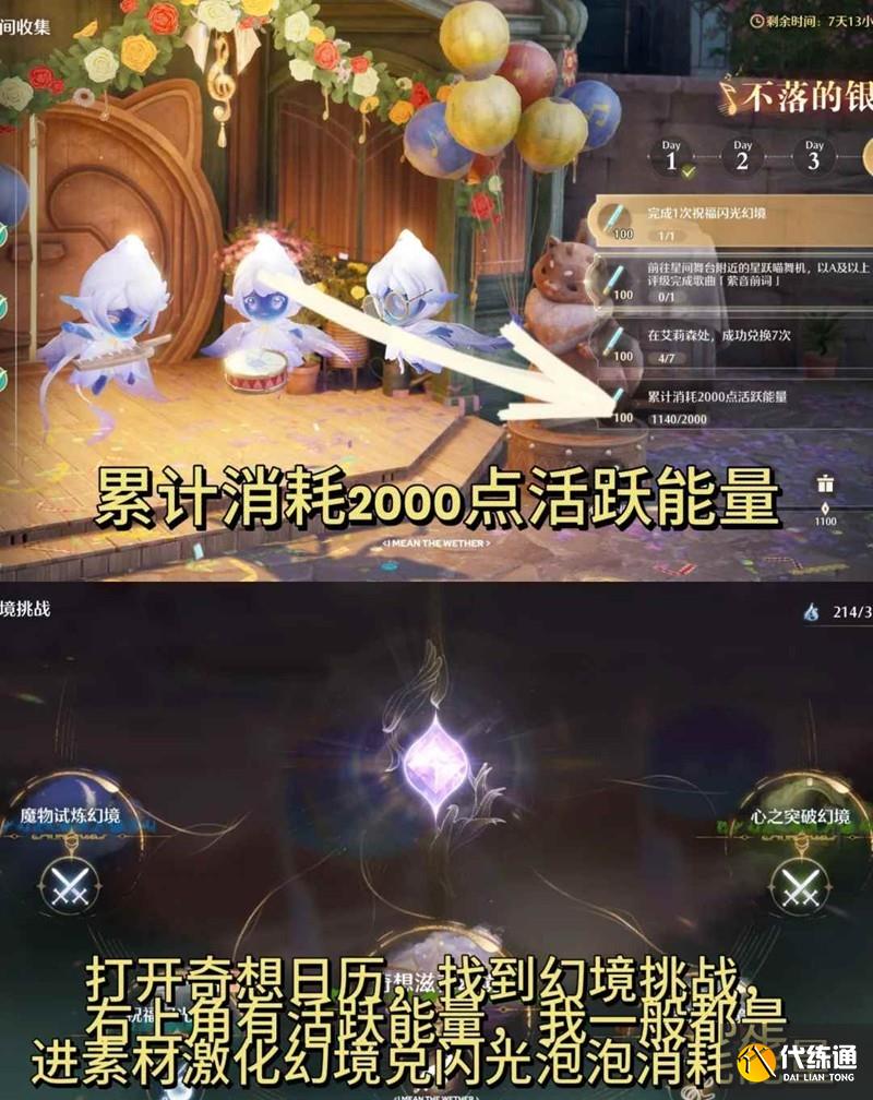 打开奇想日历,找到幻境挑战,右上角是每天的活跃能量,我一般进素材激化幻境兑闪光泡泡消耗能量