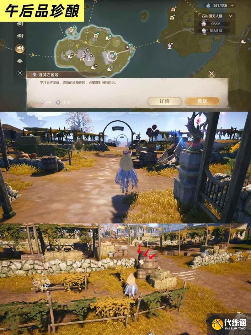 位置:传送落地后向身后走,经过一个木质拱门后,史丢丢在路右侧最大的木桶后面。