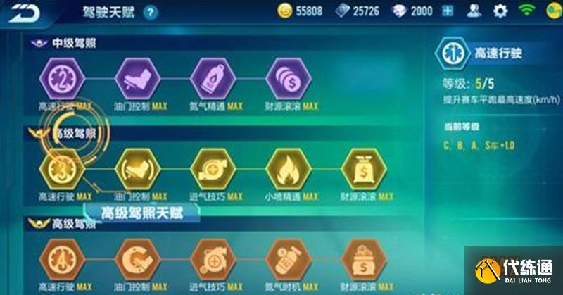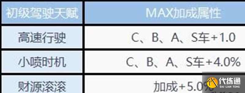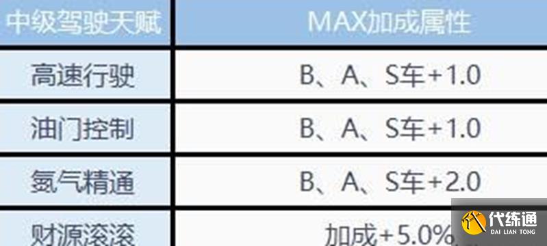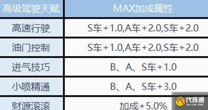 高级驾驶天赋需要获得高级驾照,包含五个技能:高速行驶、油门掌控、进气方法、小喷醒目和财源滚滚。这些天赋主要强化B、A、S级车辆的性能,其中高速行驶和油门掌控对A车和S车的提升最为明显,进气方法提高集气效率,小喷醒目增强小喷加速度。