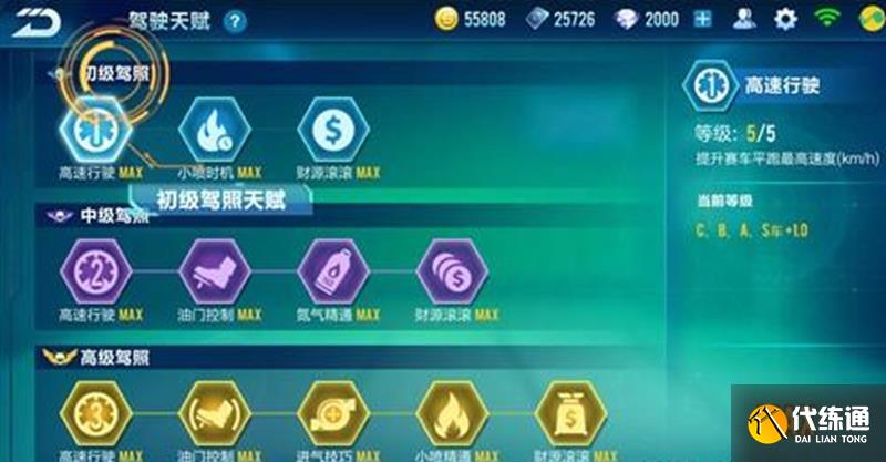 低级驾驶天赋适用于C、B、A、S级所有车辆,包含高速行驶、小喷机遇和财源滚滚三个技能。高速行驶提升赛车平跑时的最高速度,小喷机遇增加小喷的持续时间,财源滚滚则提高对局中获得的金币和经验。这些技能最高可升至5级,升级需要消耗金币。
