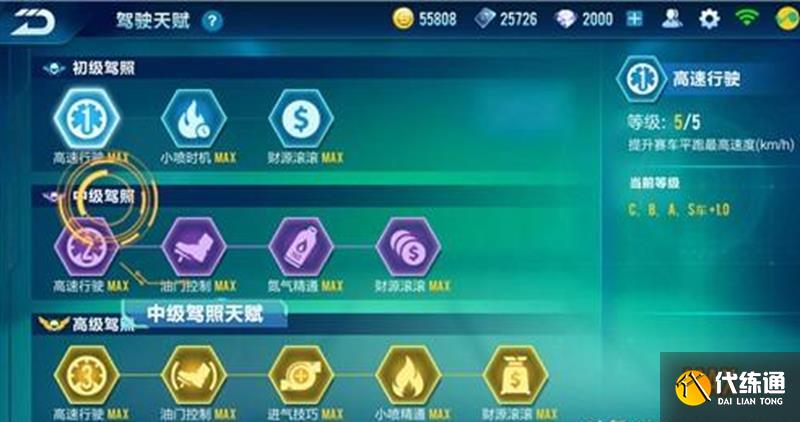 中级驾驶天赋需要解锁中级驾照,包含高速行驶、油门掌控、氮气醒目和财源滚滚四个技能。油门掌控提升赛车加速度,氮气醒目提高氮气积累速度。中级天赋仅对B、A、S级车辆生效,所有技能最高等级均为5级。