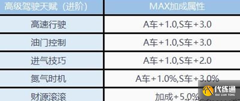 高级进阶驾驶天赋需要玩家达到40级并拥有高级驾照,仅适用于A车和S车。该阶段包含高速行驶、油门掌控、进气方法、氮气机遇和财源滚滚五个技能,特别强化了S车的各项性能。除了财源滚滚外,其他天赋对S车都有显著加成。