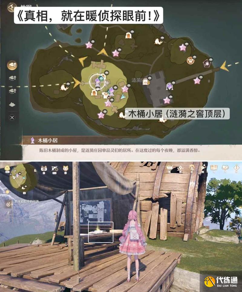 2.《真相,就在暖侦探眼前!》:【木桶小居】右后方,剧情里推理板所在地,石树之心再往前的木桶背后。推理板旁边的桌子上。