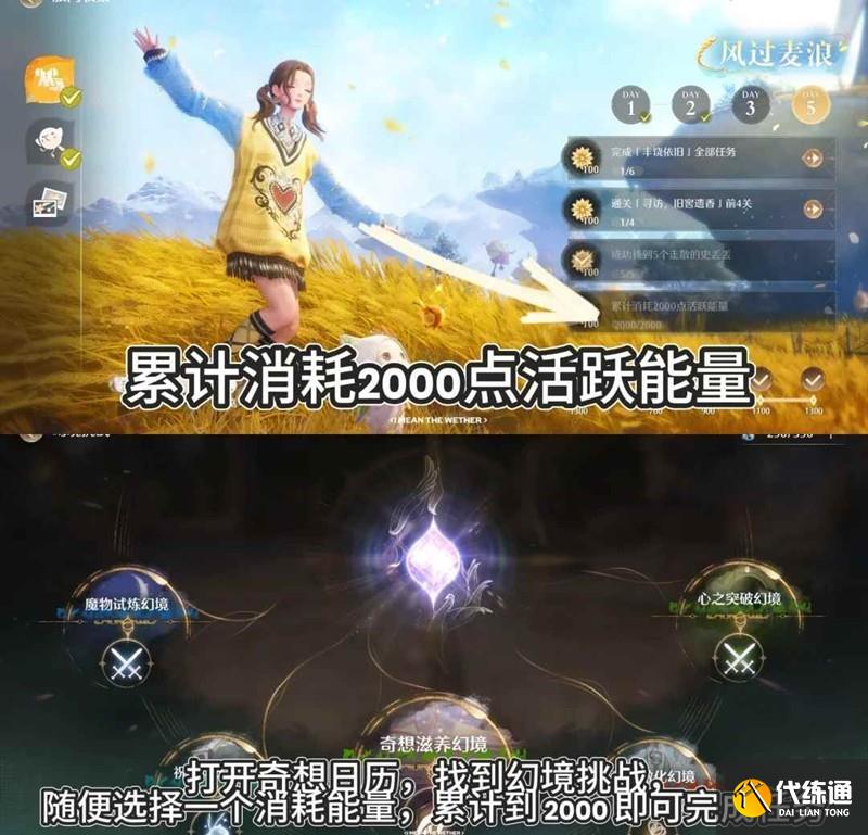 打开奇想日历,找到幻境挑战,随便选择一个消耗能量,累计到 2000 即可完成任务