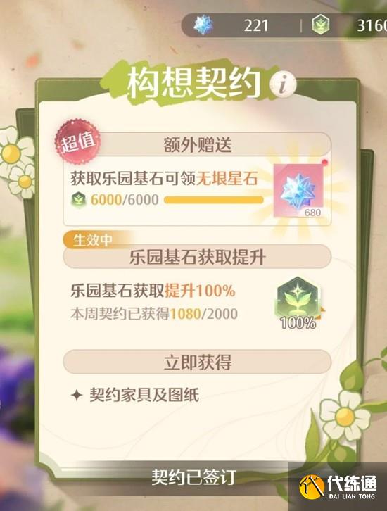 官方描述:搭配师可以消费无垠星石签订契约,签订后可领取全新契约家具和图纸,并且完成本期纪事任务之后,将会获得额外的乐园基石。签订契约后,会返还当周额外的乐园基石,不会返还当周之前的乐园基石。获取乐园基石进度到达6000可领取无垠星石。