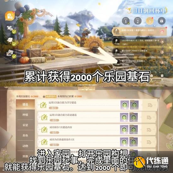 进入家园,打开乐园构想,找到乐园纪事,完成里面的任务就能获得乐园基石,累计达到2000个即可完成任务