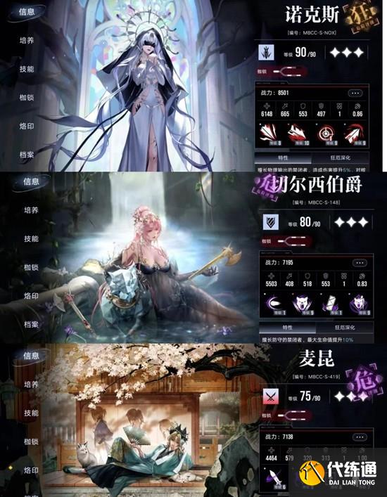 大部分练度不是很重要,比较重要的角色是伯爵和nox,其他都是破核,回血,debuff工具人