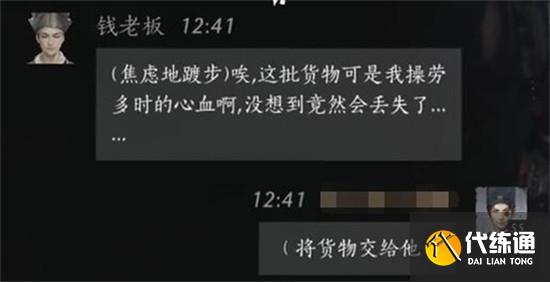 燕云十六声中钱老板的聊天对话需要按照特定顺序完成交付与回应,关键在于将货物交出后说出“我从土匪手里抢的”。