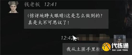 玩家在交付货物后,需选择回应“我从土匪手里抢的”这一句台词。这句话是预设的标准回答,能够正确衔接钱老板的反应并推动对话继续。若选择其他无关语句,可能导致对话中断或无法获得奖励内容。确保在对话界面中准确输入或选择该句,以保证流程顺利进行。