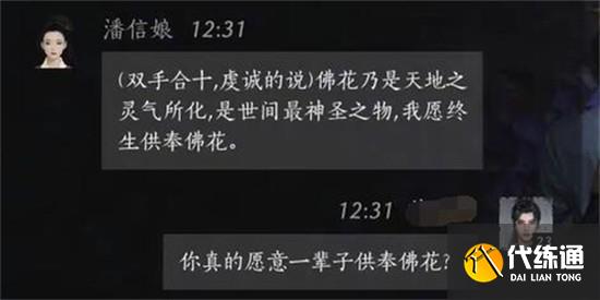 玩家首次与潘信娘开启对话时,可选择提问“你真的愿意一辈子供奉佛花?”作为起始句。这句话将触发后续剧情线索,引导对话进入更深层次的内容,同时也是推进该段对话任务的关键切入点之一。