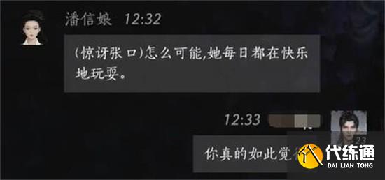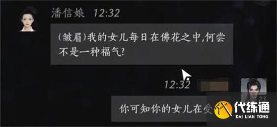 当对话继续深入后,玩家应提出“你可知你的女儿在受苦。”这句话直接触及核心矛盾,促使潘信娘产生情绪波动,也是整个对话流程中的重要转折点,有助于解锁更多剧情信息。