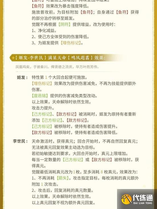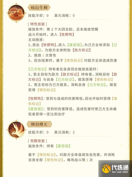 该技能为姬发的核心特性技能,无需消耗真元且无冷却时间。从第二个大回合开始,在满足条件时自动触发觉醒效果。战斗初始阶段,姬发处于【牧野阵】状态,此状态下自身及全体队友受到与造成的伤害均有所降低。当满足施放条件时,姬发将主动退出【牧野阵】,进入【度邑铭】状态,并为己方全体添加【己方标记】,同时为敌方全体附加【敌方标记】。进入新状态后,姬发会立即施放一次普攻,并在回合结束时根据所持有的【增伤标记】对敌方全体造成额外伤害。