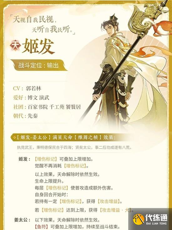姬发的满星天命【维周之桢】进一步强化了其战斗机制。该天命不仅提升生命上限,还增加【增伤标记】的可叠加层数上限,且觉醒技能不再消耗标记,使得姬发在高层数状态下能持续享受增益。每层【增伤标记】都会直接提升普攻伤害,配合攻击增益效果,使其在后期具备极强的爆发潜力。即使天命被解除,部分增益效果仍可保留,体现出姬发作为核心输出兼辅助体系支撑者的双重定位。