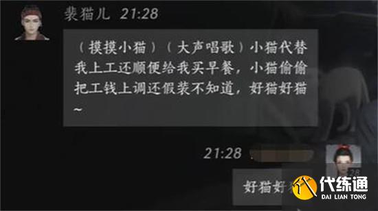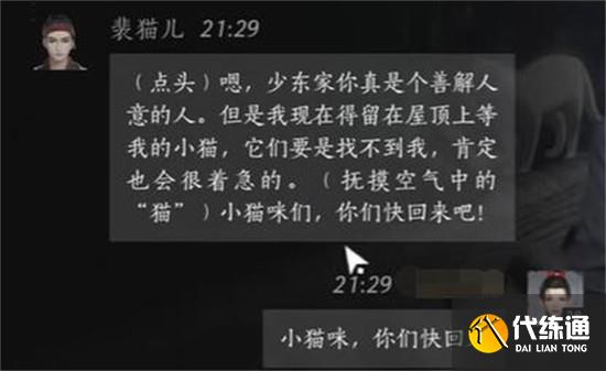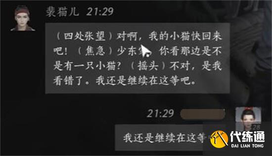 最后一句为“我还是继续在这等吧”,说完后整段对话结束。至此,燕云十六声中关于裴猫儿的全部聊天内容全部解锁。该对话虽短,但结构完整,情感递进清晰,是燕云十六声剧情体验中不可忽视的小片段。