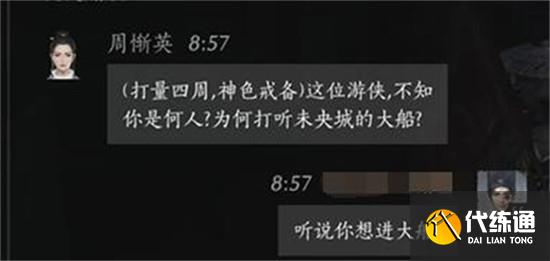 燕云十六声中周渐英的聊天对话需按指定语句顺序完成,从“听说你想进大船?”开始,依次说出后续两句即可达成互动目标。