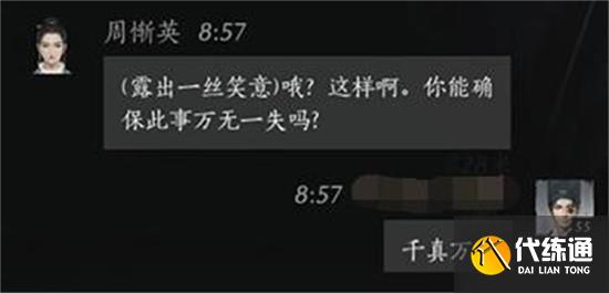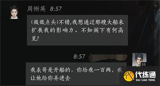 接下来的两句由玩家主动发起,系统不会提供选择,需手动输入或点击预设语句。“我表哥是开船的,你给我一百两,我让他给你弄进去。”这是第二句必须说出的对话内容。紧接着第三句为“千真万确。”,三句话依次说完后,整个与周渐英的聊天流程即告完成。这一系列对话构成了燕云十六声中该NPC互动的核心环节。