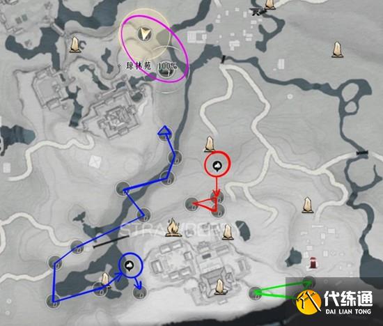 从地图上的蓝色标记出发,沿着路径一路前行至蓝色圆圈所示洞口,内部有野怪驻守,清理后可攀爬梯子,在攀爬过程中持续进行采集操作,该路线的独山玉点位较为集中,适合快速拾取。红色路线则需从红圈洞口进入,内部结构复杂且存在分叉路径,两条支路均分布有独山玉,必须全部走完才能确保采集完整。绿色路线可通过制造界面直接传送:打开背包,进入制造栏目,选择玦并指定独山玉为采集目标,系统将自动传送至武成王庙地下区域,传送后需注意方向,回头沿通道采集,避免误入前方大殿。此外,地图上另有五个紫色标记点位不可遗漏,需单独前往采集。