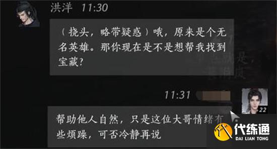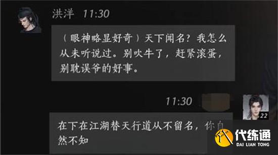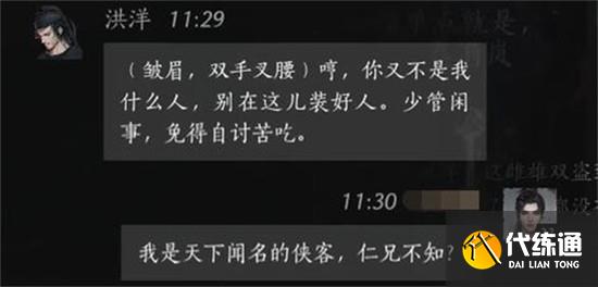 紧接着,为了增强自身说服力,玩家可以接上:“我是天下闻名的侠客,仁兄不知?”这一句设定出自燕云十六声的角色扮演机制,通过抬高身份来赢得NPC的信任。虽然洪洋并未立即回应认可,但语气已有所缓和。