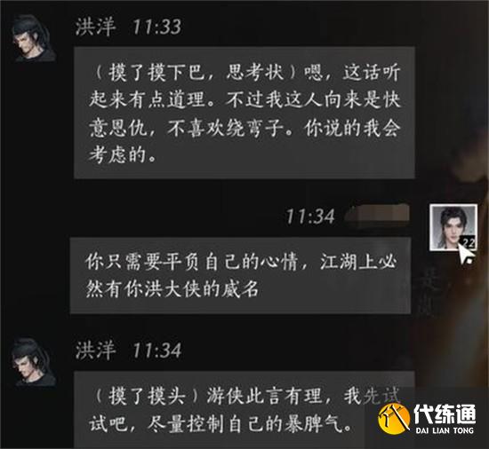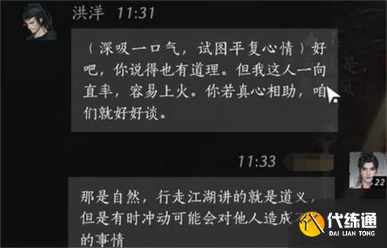 当角色形象建立完成后,应回归现实问题处理。“帮助他人自然,只是这位大哥情绪有些烦躁,可否冷静再说。”此句将焦点重新拉回洪洋的情绪管理上,体现了燕云十六声注重心理层面交互的设计理念。此时NPC的态度开始出现明显转变。