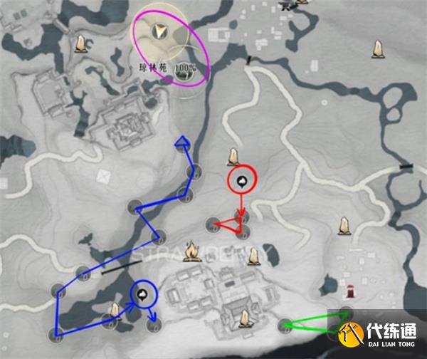 抵达后注意方向,需向后折返沿通道采集,前方为大殿区域,不建议误入。该路线适合利用传送功能快速收集。