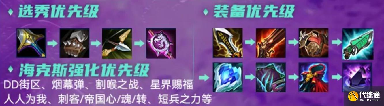 这套阵容是属于2费赌狗阵容,最优的海克斯选择就是DD街区、羽量级选手最优, 其他烟幕弹、割喉之战、星界赐福、人人为我、短兵之力、刺客/帝国心/魂/转等都可。