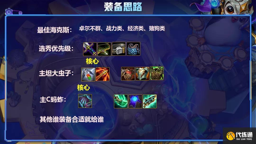 主要是鬼书搭配一个青龙或者蓝BUFF即可,最好有个科技枪但不强求,青龙的好处在于赌不出三星蚂蚱可以给两星维克托。