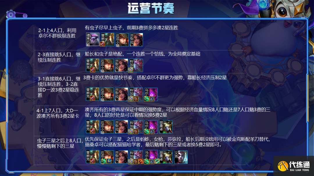 2-3直接跳5人口压连胜,有2星上2星,没有就拼34费强势卡,有虫子上虫子即可,保证前期5连胜。