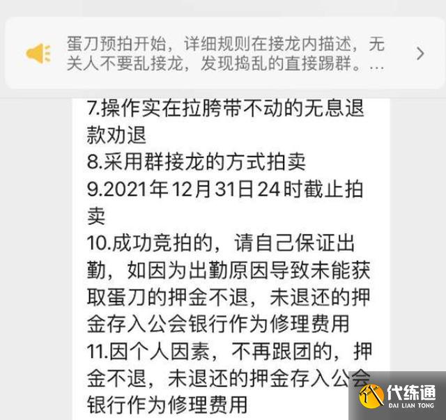 还记得魔兽怀旧服70前夕的时候,很多玩家讨论蛋刀该如何定价,当时有人认为,团长会要战贼线下预拍,价高者进本。如今P3临近,真的有G团开始了蛋刀预拍,元旦前为截止日期。