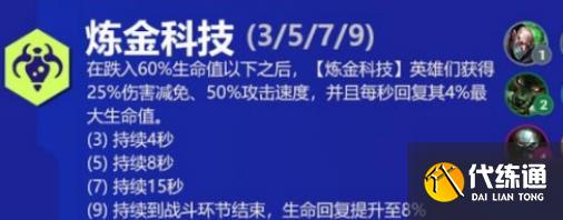 炼金英雄在生命值跌落60%以下之后,会获得25%的伤害减免,还会获得50%攻速加成,同时每秒还会回复4%的最大生命值,羁绊数量越多持续时间越长。