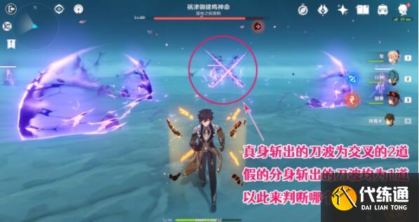 2、接着她会释放4个分身,玩家可以通过真身斩击刀波是交叉的2道的方法来判断真身。