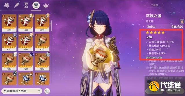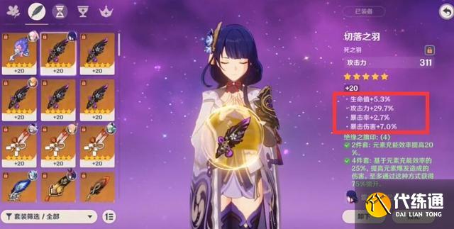 看山去也就几个限制条件,但很多氪金大佬都做不到,因为50分的圣遗物并不是人手一件。比如玩家的绝缘羽毛,副属性增加了29.7%的攻击力,这是什么概念呢?一件强化到20的攻击杯/沙漏都只能提高46%的攻击力,而圣遗物的副属性可以到30%的攻击力,相当于多了2/3件攻击杯。然后沙漏、元素杯和帽子都换成攻击力主属性的圣遗物,不过这一件攻击杯被动增加40%的暴击伤害,可以说是S级中的极品圣遗物。