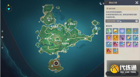 下图为黄金王兽的具体地点以及挑战成功福利;随着世界等级的提高,福利也会有所提升。