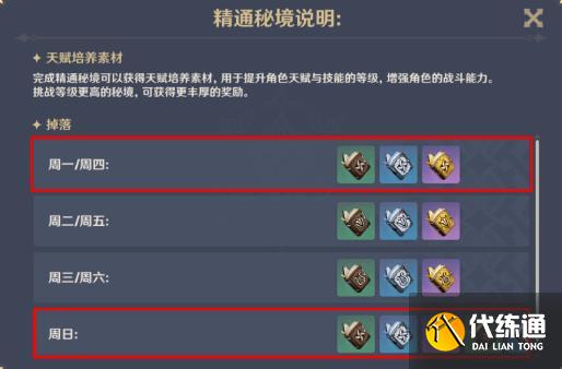 该秘境每日轮换挑战成功后可获取的天赋书类型,其中「自由」系列天赋书素材仅在每周一/周四/周日可获取;仅在周日时,旅行者可自行选择得到的天赋书类型,请一定要看清并正确选择后再进行挑战。
