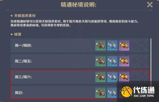 该秘境每日轮换挑战成功后可获取的天赋书类型,其中「天光」系列天赋书素材仅在每周三/周六/周日可获取;仅在周日时,旅行者可自行选择得到的天赋书类型,请一定要看清并正确选择后再进行挑战。