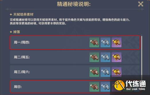 该秘境每日轮换挑战成功后可获取的天赋书类型,其中「浮世」系列天赋书素材仅在每周一/周四/周日可获取;仅在周日时,旅行者可自行选择得到的天赋书类型,请一定要看清并正确选择后再进行挑战。
