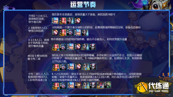 刺客遇到同行是非常正常的事情,所以前期一定要压连胜,因为是2费卡,有22张,所以4阶段2家三星都是很正常的,但是如果卡特比较天谴,到了4-6的正确做法是抬一人口,把羁绊挂的更高,靠血量吃分。