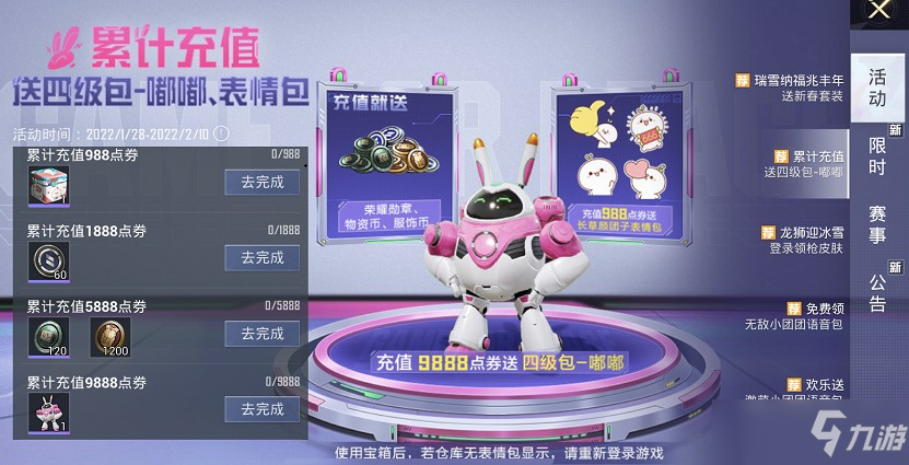 和平精英四级包嘟嘟获得攻略 1:首先这个四级包嘟嘟是今天才上线的活动,是一个累冲的活动,活动的时间是1月28日至2月10日,路径在大厅,活动,累计充值里面找到的,活动的规则相信大家都清楚的,就在规定的时间内充值的金额达到一定的数值就可以领取对应的奖励哦; 2:这个嘟嘟是最后一个也就是9888点券 阅读全文...