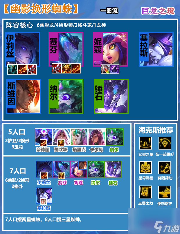 【幽影换形蜘蛛】 【阵容介绍】 手游“蜘蛛”的强度不是特别高,但是毕竟有“赛芬”,大成之后有机会吃鸡。很难弑神,对战三星【狗熊】没有优势(一直冷门就是因为狗熊)。 娱乐的“蜘蛛”出“法爆”+“无尽”,飞天跳跳蛛。 【阵容原理】 【幽影龙】的伤害可以偷攻击力和法强,还自带减双抗,给“蜘蛛”和“赛芬 阅读全文...