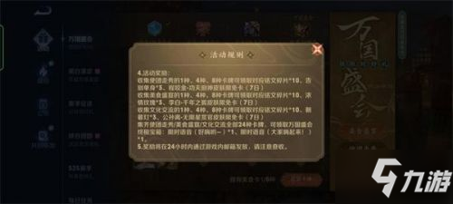 王者荣耀万国盛会活动攻略 1、通过大厅-活动-万国盛会,可以参与该系列活动; 2、活动时间:9月24日-9月30日; 3、活动期间,收集使团走秀、美食盛宴、文化交流卡牌,可解锁对应切片和奖励; 4、卡牌获得: A、每日登陆,可以获得4张未拥有卡牌; B、完成5v5对局,每日可以获得4张随机卡牌; C、通过5V5对局,获胜后每日最多可以获得2张随机卡牌; 同时,通过上述系列活动的参与,小伙伴们有机会获得包括语音、皮肤限免卡等在内的奖励。 王者荣耀万国盛会活动的玩法都已经分享在上面,对活动感兴趣的可以多了解了解。"> 王者荣耀中有一个万国盛会,这个万国盛会的玩法类似于卡牌,通过上述系列活动的参与,小伙伴们有机会获得包括语音、皮肤限免卡等在内的奖励,很多玩家不知道这个活动要怎么玩,小编整理和收集了有关攻略,下面就来一起看看吧。 王者荣耀万国盛会怎么玩 万国盛会活动攻略" src="https://media.9g 阅读全文...