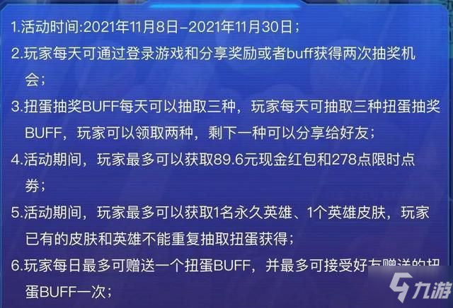 1、活动时间:2021年11月17日-2021年11月28日; 2、玩家每日可完成【登录游戏】、【分享奖励/buff】两个任务各获得一次扭蛋抽奖机会,单日最多获得两次扭蛋抽奖机会; 3、玩家登录游戏后即可进行扭蛋BUFF抽取,每日可以抽取一次,每次可抽取三个扭蛋BUFF;玩家可以领取其中两个扭蛋BUFF,剩余一个扭蛋BUFF可以分享给好友;每日最多可成功赠送一种扭蛋BUFF,最多可接受好友赠送的扭蛋BUFF一次; 4、玩家可选择已获得的扭蛋BUFF进行合成,合成可随机获得【幸运英雄BUFF碎片】、【幸运皮肤BUFF碎片】、【幸运红包BUFF碎片】之一,每种碎片收集满6个后可将碎片兑换对应的正式BUFF,点击使用BUFF后生效,必得BUFF对应的奖励;如玩家已经拥有全英雄全皮肤,【幸运英雄/皮肤BUFF】将无法生效,请谨慎选择; 5、用户抽奖若抽到游戏内道具、永久英雄、永久皮肤等奖励,奖励将在7个工作日内发放到王者荣耀游戏内邮箱,请玩家及时领取;如抽中已有的永久英雄/皮肤,将自动转换为英雄/皮肤碎片; 6、手Q用户若抽到现金奖励,奖励将在14个工作日内发放至对应的QQ账号钱包内;领取现金奖励前,请确认已完成实名认证;未实名认证的用户,请在24小时内实名认证,实名认证后请前往QQ钱包公众号详情主动发起收款,超时未领取视为放弃; 7、微信用户若抽到现金奖励,奖励将在14个工作日内通过“微信游戏公众号”方式发放,未关注该公众号的用户,请在微信内搜索关注进行领取;领取现金奖励前,请确认已完成实名认证;未实名认证的用户,请在24小时内实名认证,实名认证后请前往添加“微信游戏公众号”添加后该公众号将会触发发放,超时未领取视为放弃; 8、用户绑定区服角色后即可参与活动,确认绑定后不可更换; 9、在活动期间进行转区的玩家可能会出现活动异常的情况,请召唤师们在活动期间谨慎转区,转区导致的异常将无法处理;"> 王者荣耀扭蛋活动入口是什么?怎么玩?都有哪些攻略呢?扭蛋活动入口是不少玩家好奇的,想知道具体的规则和玩法,以下我们带来了扭蛋活动入口的介绍,一起来看看吧。 扭蛋活动入口 王者荣耀扭蛋活动入口全攻略" src="https://media.9game.cn/gamebase/2021/11/17/2 阅读全文...