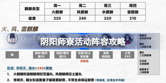 在阴阳师游戏中,玩家们加入阴阳寮之后每天都能够参加不同的活动,那么这些活动的阵容该怎么搭配呢,下面就一起来看看具体的攻略分享把,感兴趣的小伙伴千万不要错过哦。 阴阳师寮活动阵容怎么搭配 一、麒麟 周一火麒麟,周二风麒麟,周三水麒麟,周四雷麒麟 二、寮退治 年兽、包子、铁铁鼠 三、阴界之门 周 阅读全文...