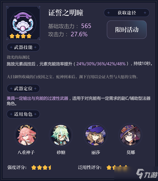 武器数据 证誓之明瞳 攻击力:565 副属性:27.6攻击力加成 获取途径:限时活动 武器特效:在角色释放元素战技后,提升该角色24%/30%/36%/42%/48%的元素充能效率 武器定位 兼具一定输出与充能的过渡性武器,适用于对充能有一定需求的副C/辅助型法器角色。 适用角色 与常用充能类法 阅读全文...