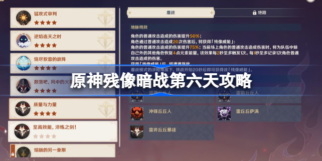原神残像暗战第六天的关卡是至高效能,淬炼之剑,很多玩家不知道用什么阵容,下面小编为大家带来原神残像暗战第六天攻略,感兴趣的小伙伴一起了解一下吧。 原神至高效能淬炼之剑怎么打 今日Buff: 今日普通攻击造成的伤害提升50%/75%,获得残像威能时普攻还会为队友回复元素能量。 因为今天为普攻伤害加 阅读全文...