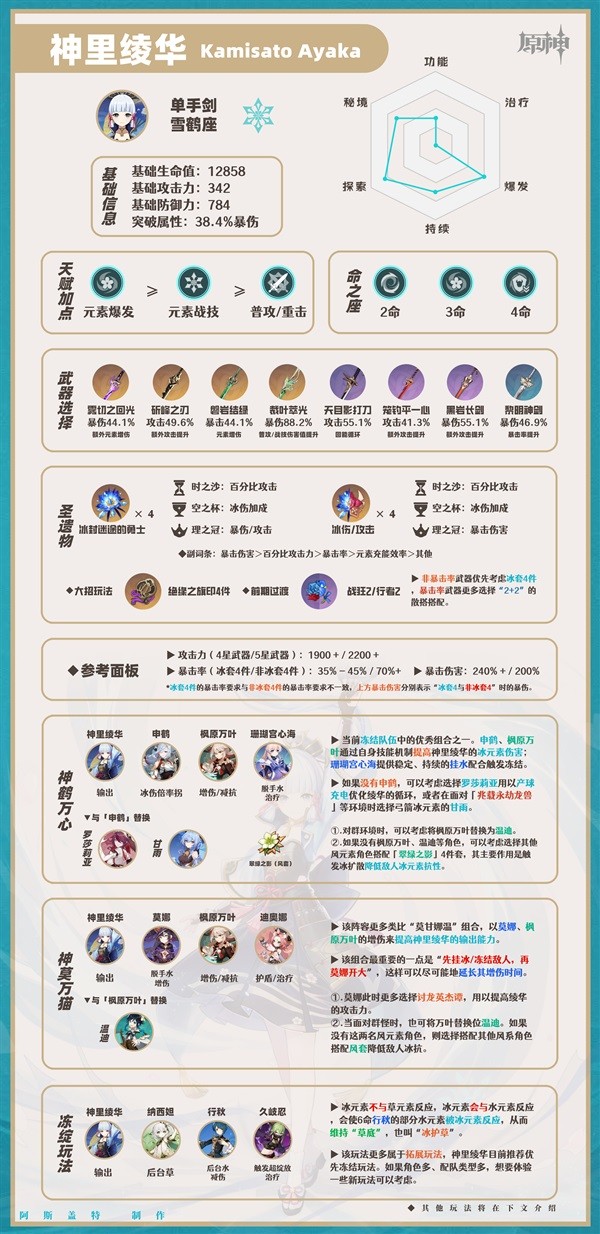 《原神》在3.5版本再次开启了神里绫华的获取卡池,那么这名角色的武器和圣遗该如何选择呢,下面请看“Asgater”带来的《原神》神里绫华一图流培养指南,希望能够帮助大家。 角色简析 「神里绫华」是一位冰元素输出角色。她能通过施放神里流·霞步化为激流快速移动,使自己获得冰元素附魔。也能通过元素战技与 阅读全文...