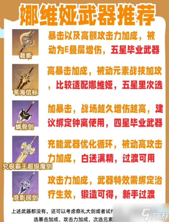 娜维娅圣遗物: 圣遗物首选回声套,次选剧团套,猎人本刷的比较多的也可以用。 如果想快速毕业可以选,2角斗2剧团 萌新战狂,赌徒,勇士都可以带 词条方面 攻击沙 岩伤杯 双爆头,杯子刷不到岩伤杯可以带攻击杯。副词条追双爆 充能 和攻击百分比(大攻击) 命座推荐: 平民:推荐0命 厨子:推荐2命(+36%暴击) 氪佬:抽六命(+135%爆伤/返还弹片) 配队推荐: 最好是能带钟离,后面两个队友能带香菱 班尼特,可以带夜兰 行秋,可以带菲谢尔 北斗,可以带班尼特雷神打双c,当然伤害最高是带班尼特芙宁娜(2命最佳) 如果没有钟离,可以带其他盾角色。如莱依拉 绮良良,手法自信的可以把盾角色换成凝光打速切,或者阿贝多结晶会产的更多,反正配队很灵活"> 娜维娅武器推荐: 裁断:暴击以及高额攻击力加成,被动为E叠层增伤,五星毕业武器 苇海信标:高暴击加成,被动元素战技加攻比较适配娜维娅,五星里次选 螭骨剑:加暴击,战场越久增伤越高,建议绑定钟离使用,四星毕业武器 究极霸王超级魔剑:充能武器优化循环,被动高攻击力加成,白送满精,过渡可用 浪影阔剑:攻 阅读全文...