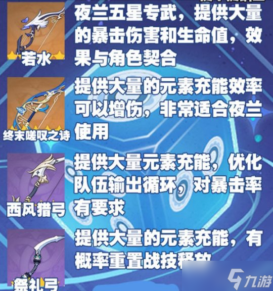 武器推荐: 5星武器首选终末嗟叹之诗,大幅度提高充能效率,同时提高全队元素精通与攻击力。 次选若水,猎人弓,天空之翼… 5星武器: 终末嵯叹之诗 若水 猎人之径 天空之翼 4星武器: 西风猎弓 潜霞 祭礼弓 3星武器:反曲弓 副词条为:暴击爆伤/生命值/元素充能效率的武器都可以使用! 圣遗物推荐: 主词条推荐:充能/生命沙 水伤杯 暴击冠 副词条推荐:元素充能效率暴击爆伤生命值 夜兰需要优先保证需要优先保证210%+的元素充能效率,以及65%+暴击率后,再去堆叠生命值以及暴击伤害 圣遗物套装效果首选4绝缘,提高充能的同时,根据充能属性增加大招伤害 次选2生命+2水伤/宗室即可,前期可选2充能+2暴击过度 配队思路推荐: 夜兰+主C+主C反应副C+奶/盾 夜兰配队主要围绕水元素反应,例如蒸发 绽放激绽 扩散 冻结 "> 角色定位:水系弓箭增伤副C 技能加点优先级:大招=战技普攻夜兰 关键命座:1命/2命/4命/6命 原神】V4.8攻略 | 夜兰培养攻略" /> 武器推荐: 5星武器首选终末嗟叹之诗,大幅度提高充能效率,同时提高全队元素精通与攻击力。 次选若水,猎人弓,天空之翼… 5星武器: 终末嵯叹之诗 若 阅读全文...