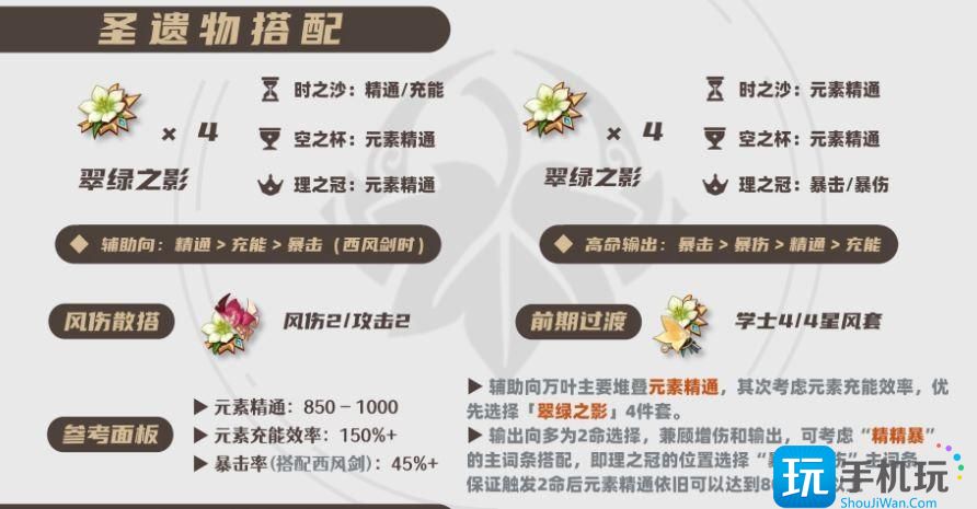 原神2025枫原万叶圣遗物选择推荐 圣遗物优先「翠绿之影」4件,配合触发扩散降低敌人元素抗性。 辅助时,主词条优先“精精精”,可根据自身情况调整为充能沙漏(充能较低)、暴击头冠(携带西风剑时);风伤输出时,兼顾输出与辅助可考虑“精精暴”、专注输出时可“精风暴”。 阅读全文...