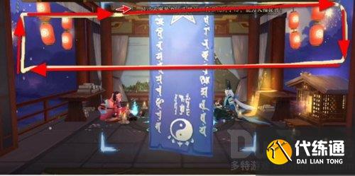 画到红布下方的三角尖的位置拐过来往左侧画,保证穿过第五个符咒,画出边框向下拐。
